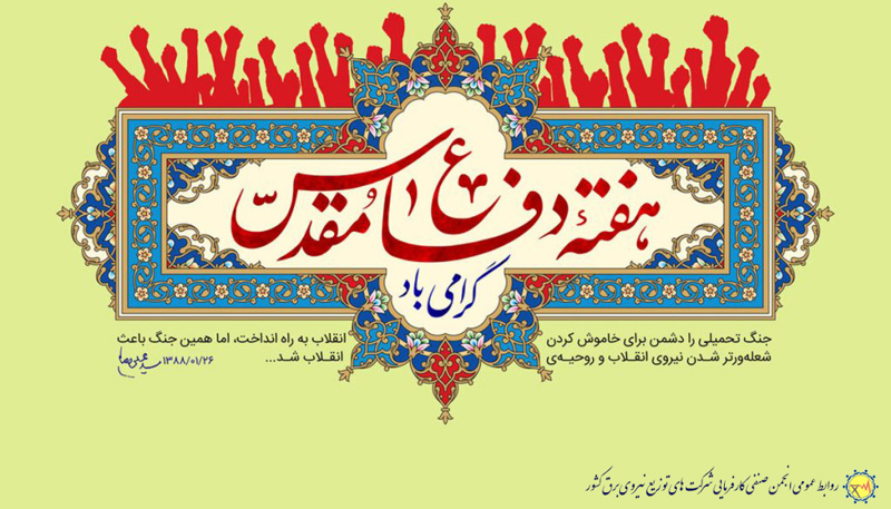 🔸انجمن صنفی کارفرمایی شرکت های توزیع نیروی برق؛ ضمن گرامیداشت و تبریک هفته دفاع مقدس و یاد و خاطره بنیانگذار کبیر انقلاب اسلامی و رشادتها و دلاورمردیهای تمامی شهیدان گرانقدر، رزمندگان، ایثارگران، جانبازان و آزادگان هشت سال دفاع مقدس از خداوند متعال، سربلندی ایران اسلامی و توفیقات روز افزون ملت همیشه سر افراز را در پرتو الهی مسئلت دارد.