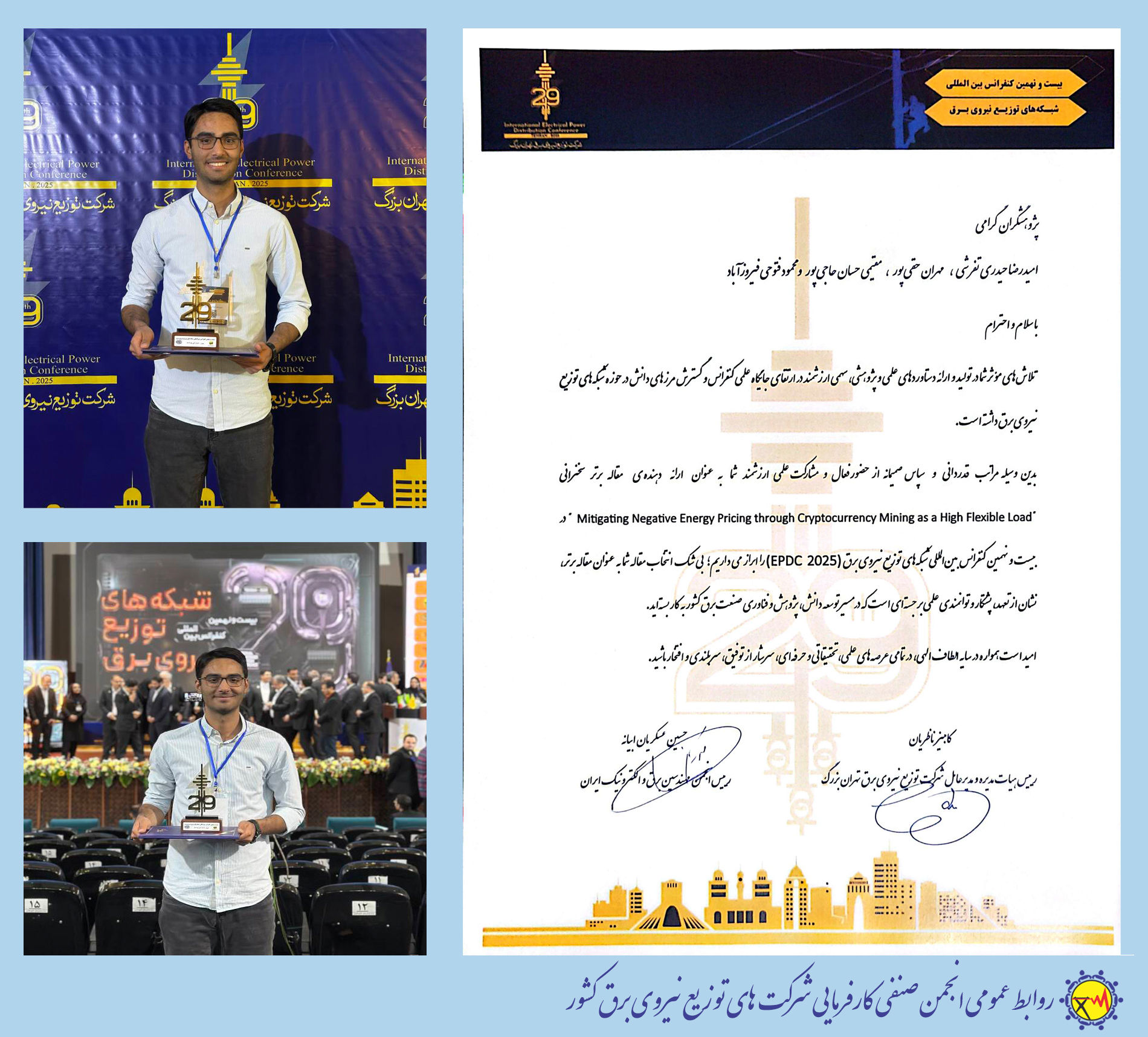▫️با افتخار به آگاهی میرساند جناب آقای دکتر امیدرضا حیدری تفرشی فرزند مدیر اجرایی انجمن صنفی کارفرمایی شرکت های توزیع نیروی برق، با ارائهی مقالهای با عنوان «Mitigating Negative Energy Pricing through Cryptocurrency Mining as a High Flexible Load» در بیستونهمین کنفرانس بینالمللی شبکههای توزیع نیروی برق (EPDC 2025)، موفق به کسب رتبه برتر(اول) در بخش مقالات سخنرانی گردیده است.